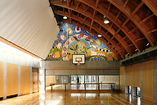 小さな体育館のような大ホールはスポーツ対応の床で、ミニバスケッットができるようにバスケットゴールを備え、バドミントンのネット設置も可能です。 またダンスやバレエのための鏡と手摺も設えました。